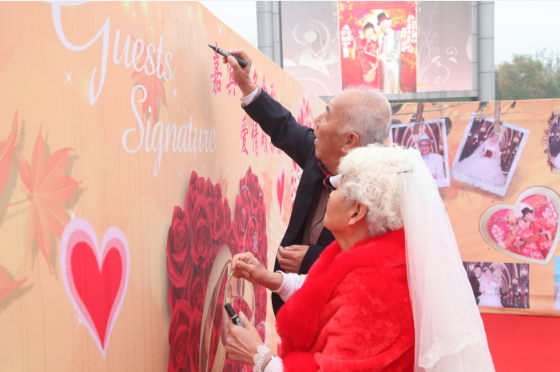 丰富温馨的活动环节让老年人经历了一次感动、难忘的金婚庆典仪式:“五十年风雨同路”——金婚夫妇身着婚纱礼服甜蜜携手走红毯,每一步都是手挽着手的坚定不渝。走过浪漫的鲜花拱门,在签名墙上共同写下爱的箴言;“这一路感谢有你”——金婚夫妇恩爱照在大屏幕上循环播放,金婚男士为女士献上代表坚贞爱情的玫瑰,秀出了金色约定的温馨与感动,每一个羞涩的笑容,一次深情的对视,都是相濡以沫的最好见证;“激情燃烧的岁月”再回首——老人牵手跳起熟悉的舞步,追忆年轻时那些激情燃烧的岁月,展现老年人独特的精气神儿。“蒙眼找妈妈”——记忆中的妈妈还是年轻的模样,如今抚摸着这苍老的面庞,粗糙的双手,子女百感交集,真情流露那一刻让人感动不已;“感恩父母情”——子女为父母跪敬孝心茶,表达对父母的感恩与祝福;“传播爱的希望”——幼儿园可爱的小朋友为老人们带来集体表演,向老人们献上来自小小人儿的一份心意,让老人们感受到来自新一代的关爱和温暖。同时也让孩子们接受传统美德的洗礼,在幼小的心灵上播下了尊老、敬老、爱老的种子,寓意传播爱的希望。
