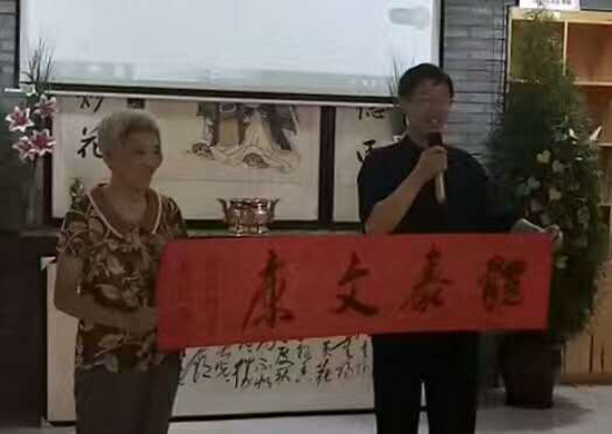 李耀君老师向现场年龄最长者(76岁)赠送书法:体泰文康