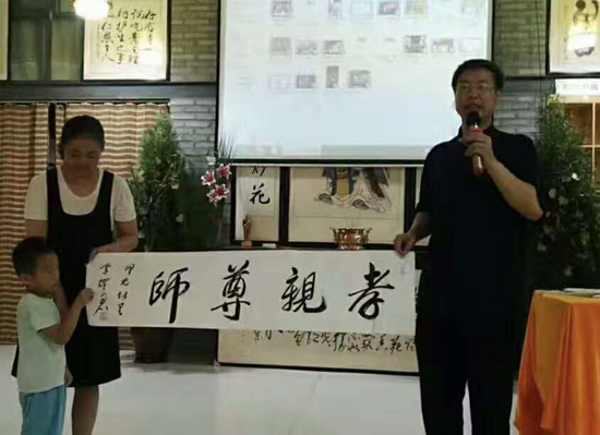 李耀君老师向现场年龄最小的4岁小朋友赠送书法 :孝亲尊师