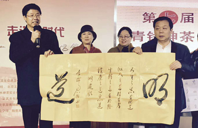 李耀君总编向承办方赠书法"修水神茶,诚信天下"