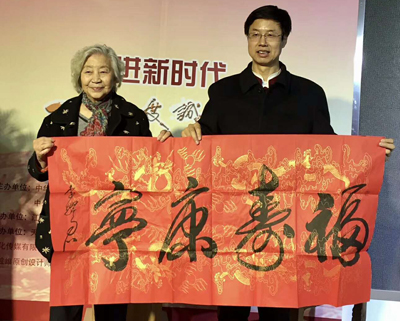 李耀君先生在国际诚信节活动上向82岁的罗玲老师赠送书法“福寿康宁”